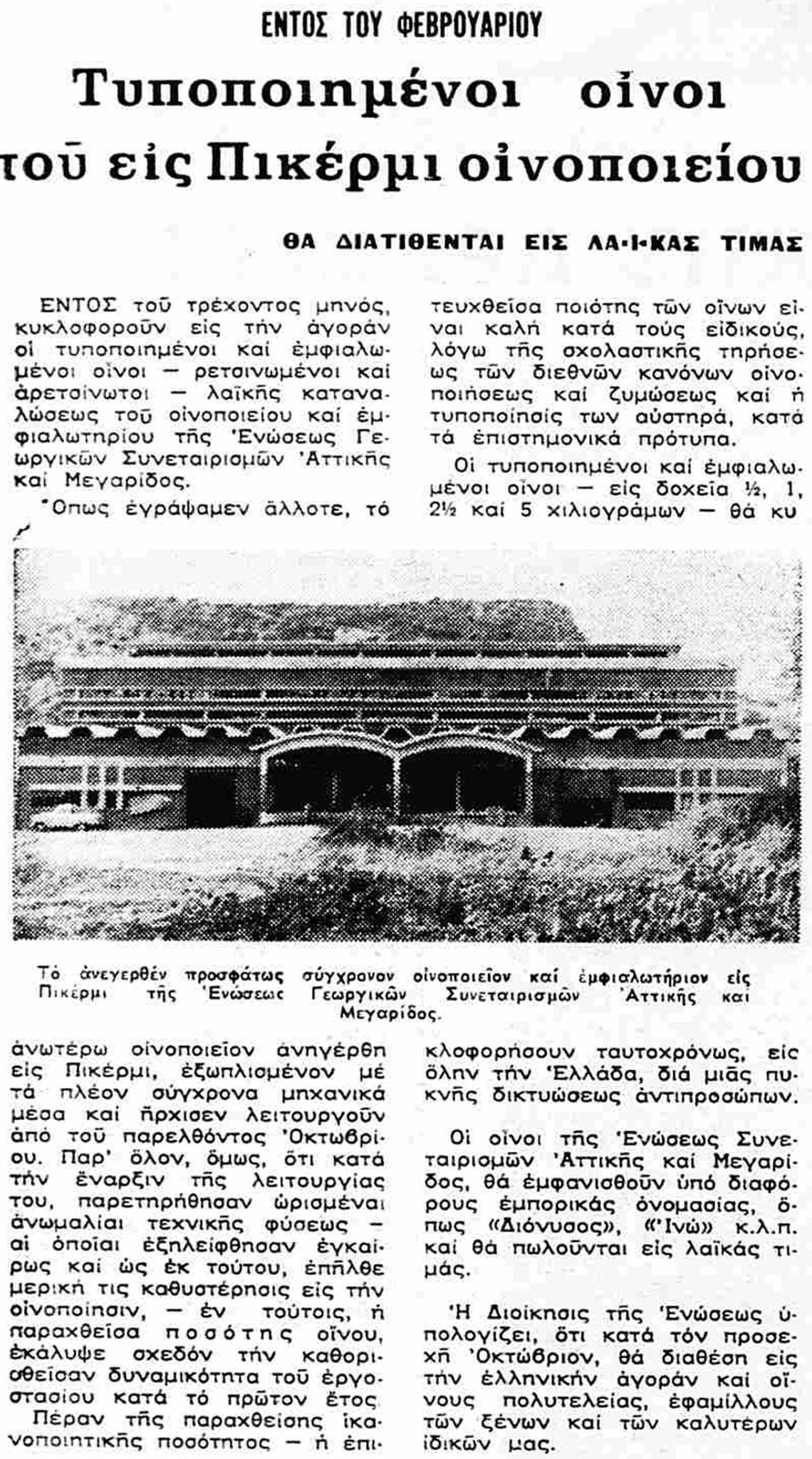 Η Πρότυπος Οινοβιομηχανία Πικερμίου της Ενώσεως Γεωργικών Συνεταιρισμών Αττικής και Μεγαρίδος ετησίας παραγωγικής δυνάμεως 6.000 τόννων οίνου.