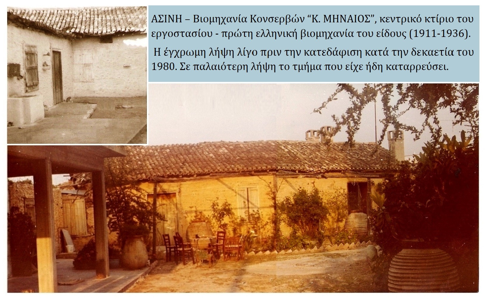 Η περιοχή της Ασίνης την εποχή αυτή βρεχόταν από τρεις χειμάρρους, ιδανική για καλλιέργεια και παραγωγή τομάτας, λόγω των εύφορων προσχώσεων. Περίπου την ίδια εποχή με τον Μηναίο ξεκίνησαν και οι «Παπαντώνηδες» στην Ασίνη τη δική τους βιοτεχνία, την μετέπειτα βιομηχανία «Κύκνος», καθώς και άλλες παρόμοιες στον αργολικό κάμπο.