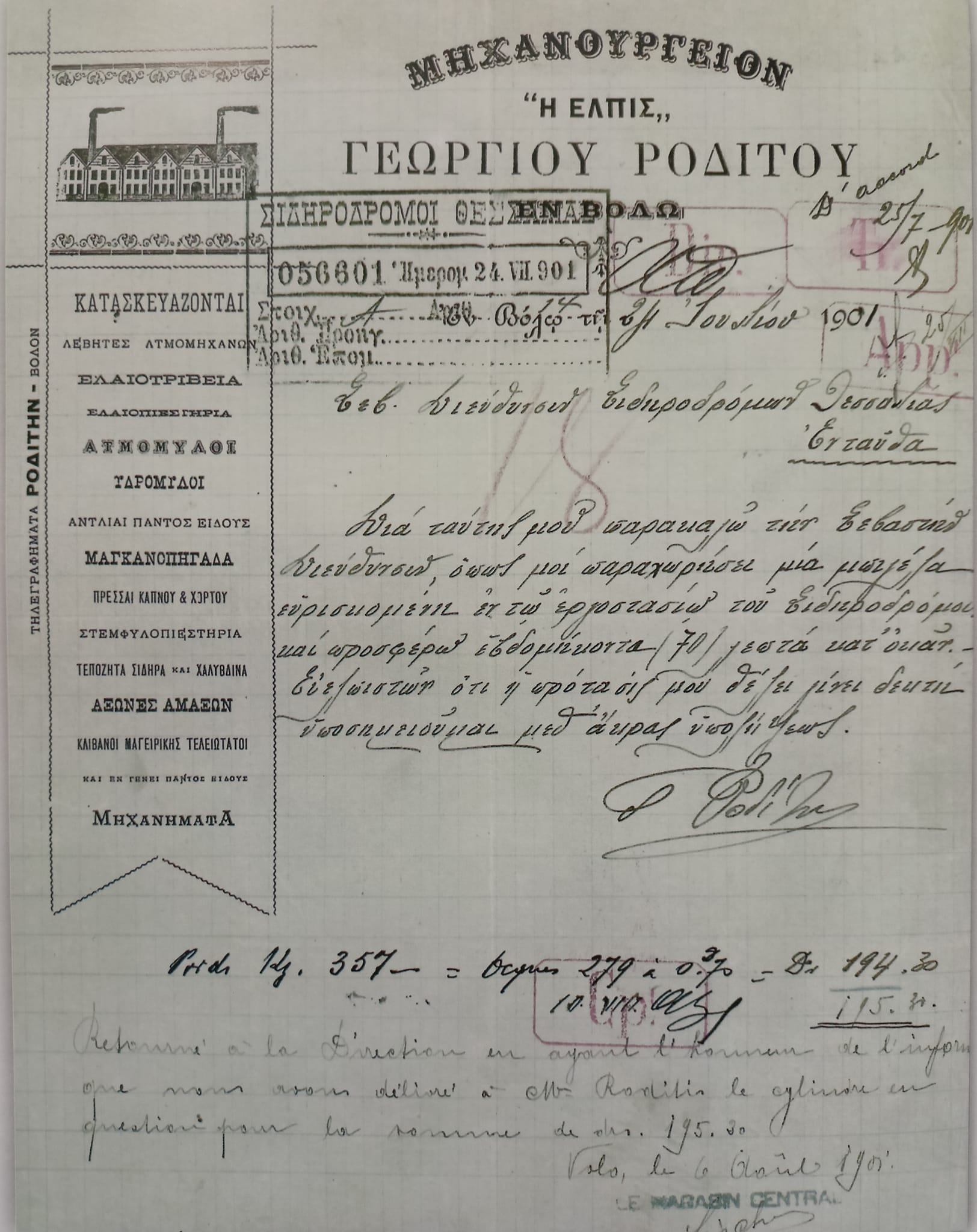 Από το 1890, το μηχανουργείο «Ελπίς» του Γεωργίου Ροδίτη αναλάμβανε την εγκατάσταση υδρόμυλων, ανεμόμυλων, ατμόμυλων, μαγγανοπήγαδων, αποθηκών λαδιού από ατσαλολαμαρίνα κλπ. Μαρτυρείται ότι το 1901 είχε εγκαταστήσει «σιδηρά μαγειρεία» σε ξενοδοχεία και στα σπίτια του Κοντού, Καρτάλη και Ρήγα...