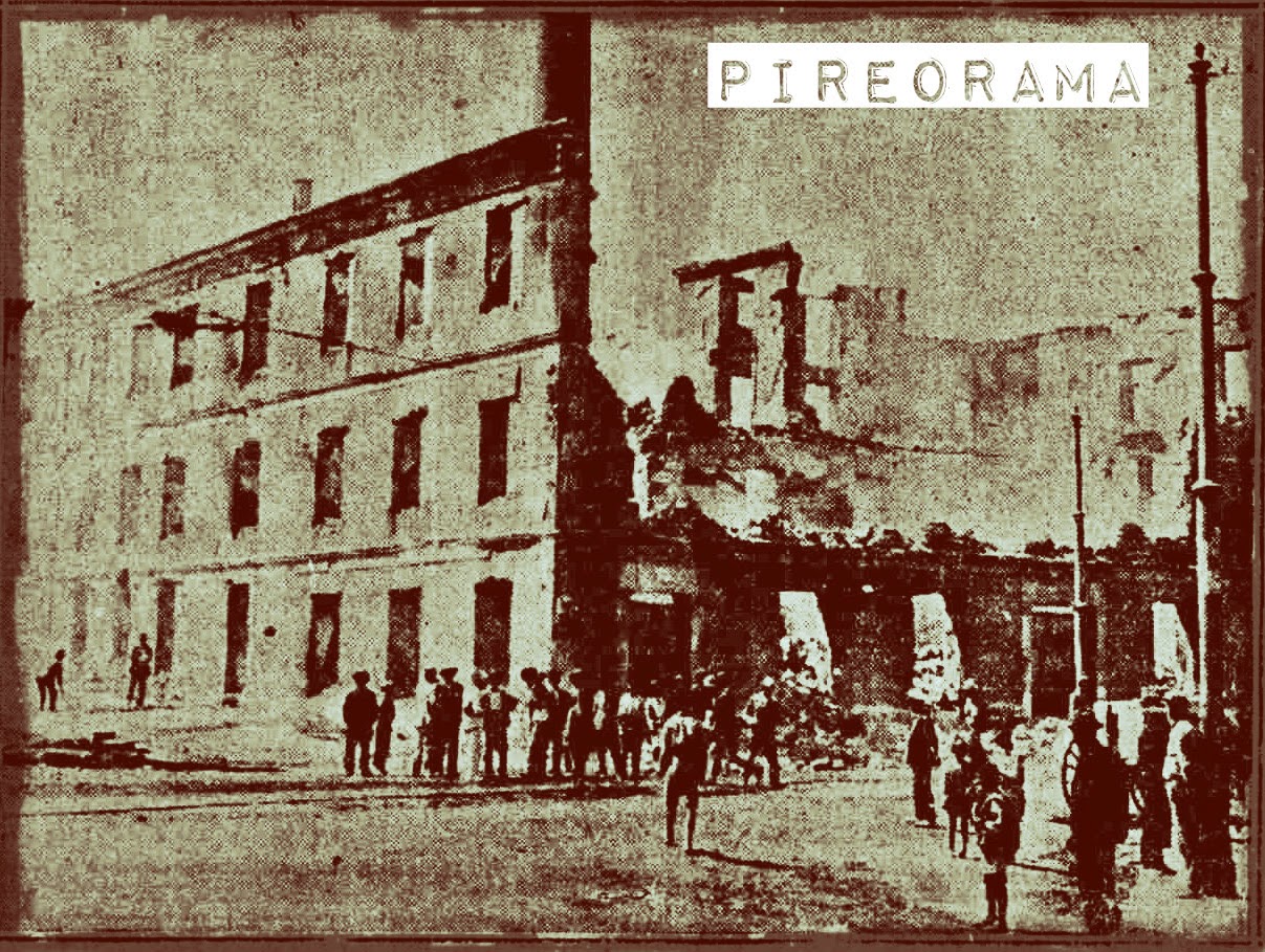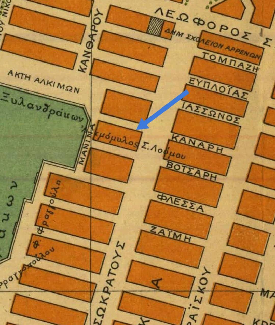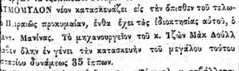 Το 1876 πίσω από το Τελωνειο στην συμβολή της σημερινής Ακτής Μιαούλη με την Ξαβερίου και στην περιοχή μεταξύ των οδών Κανάρη και Βοτσαρη με μέτωπο προς την θάλασσα χτίζεται από τον Αντ. Μανινα σε έκταση ιδιοκτησίας του ένας Ατμοκινητος αλευρόμυλος που αργότερα έγινε γνωστός σε όλο τον Πειραιά, ως "Φάμπρικα του Μανίνα" και ο οποίος θα δώσει το όνομα σε όλη την περιοχή. Την κατασκευή του εξοπλισμού του αλευρόμυλου μαζί με την μηχανή ισχύος 35 ίππων αναλαμβάνει το Μηχανουργείο "Ηφαιστος" του Τζων Μακ Δουαλ Ο μύλος του Μανινα άρχισε να λειτουργεί το 1880 με πέντε ζεύγη μυλόλιθων, αρχικά από τον ίδιο και αργότερα από τους κληρονόμους του. Ύστερα τον λειτούργησαν οι Δαμίγος κι Ελευθερίου και το 1893 τον αγόρασαν σε πλειστηριασμό οι Δ. Σ. Λούμος και Σταύρος Λούμος, οι οποίοι τον μεταρρύθμισαν.Το 1904 ιδιοκτήτης απέμεινε ο Σταύρος Λούμος και έπειτα οι κληρονόμοι του. Το 1909 μετατράπηκε σε αποθήκη. Το κτίριο νοικιάστηκε από την Εταιρεία Γενικών Αποθηκών Ελλάδος και εκεί φυλάσσονταν είδη του Τελωνείου Πειραιά. Στην περιοχή είχαν εγκατασταθεί αποθήκες γαιανθράκων, ξυλεμπορικά και ξυλουργεία. Το απόγευμα της 14ης Αυγούστου 1929 ξέσπασε φωτιά στις ξυλαποθήκες των αδελφών Ζούμπερη, με αποτέλεσμα να αποτεφρωθούν όλα τα κτίρια πέριξ των ξυλαποθηκών, μεταξύ αυτών και οι αποθήκες του τελωνείου (δηλαδή ο πρώην ατμόμυλος Μανίνα). Μετά τη φωτιά το ερείπιο του ατμόμυλου κατεδαφίστηκε.