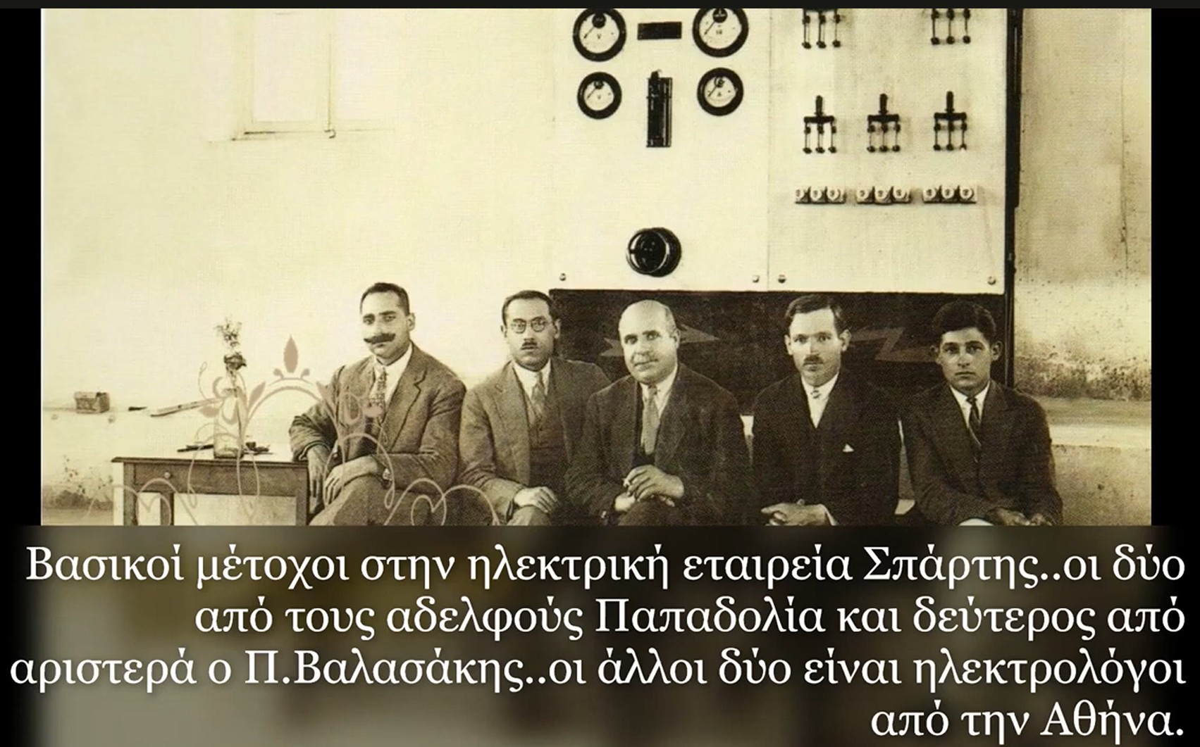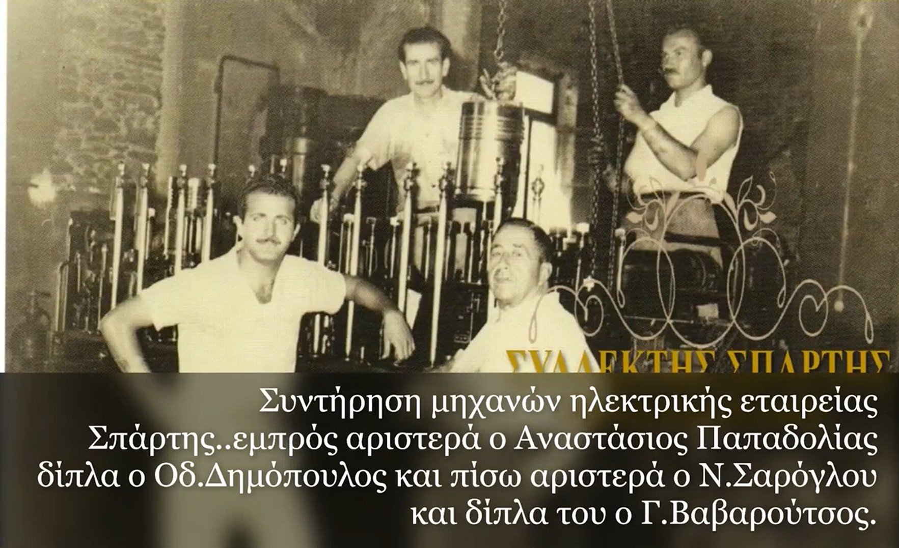 Το 1925 ιδρύθηκε, από τους αδελφούς Παπαδολιά, στην Σπάρτη μια μικρή μονάδα παραγωγής ηλεκτρικού ρεύματος για την ηλεκτροφωτηση της πλατειας. Το 1928 η επιχείρηση επεκτάθηκε παρέχοντας ηλεκτρικο ρεύμα σε δρόμους, καταστήματα και σε σπίτια. Τότε οι εγκαταστάσεις μεταφέρθηκαν στους χώρους της Ηλεκτρικής Εταιρείας Σπάρτης η οποία είχε το αποκλειστικό δικαίωμα ηλεκτροδότησης γη ία τριάντα χρόνια. Ο αρχικός εξοπλισμός επεκτάθηκε με νέα πετρελαιομηχανη το 1932 και με μια τρίτη το 1936. Το 1959 η ΔΕΗ εξαγόρασε την εταιρεία και απομάκρυνε τον εξοπλισμό. Το κτήριο παρέμεινε ιδιοκτησία μέχρι το 1998 οπότε παραδόθηκε στο Πολιτιστικό Ίδρυμα Τράπεζας Πειραιώς για την δημιουργία του Μουσείου Ελιάς και Ελληνικού Λαδιού το οποίο αποτελεί πλέον ένα κόσμημα για την Σπάρτη.