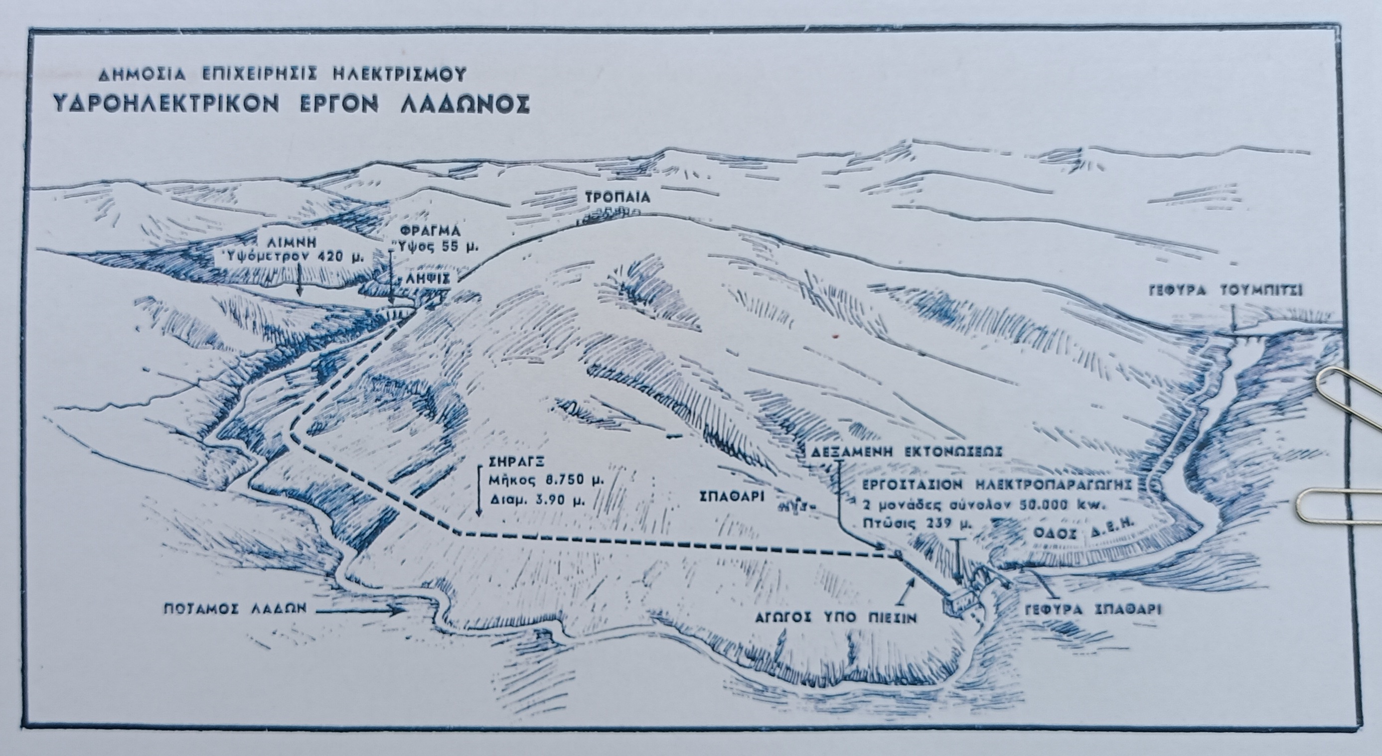 Ο ποταμός Λάδωνας είναι παραπόταμος του Αλφειού ποταμού στη γεωγραφική περιφέρεια της Πελοποννήσου. Πρόκειται για ποταμό συνεχούς και γενικά υψηλής ροής, με μέγιστο υπερθαλάσσιο ύψος 500 μέτρα και ελάχιστο 200 μέτρα. Οι κυριότερες πηγές του Λάδωνα είναι: (α) η πηγή του Πλανυτέρου από την λεκάνη των Σουδενών (ύδατα Στυγός), (β) η πηγή της Λυκουριάς (Κεφαλοβρύσου, Σαΐτά) από την λίμνη Φενεού (κοινώς Φονηά), και (γ) η πηγή Ντάρα, Παναγίτσας και Βυτίνας από τον Ορχομενό (Κανδήλα). Εκτός αυτών των πηγών αναφέρονται και εκείνες από τις οποίες αναβλύζει νερό από τα ασβεστολιθικά σχήματα εντός της λεκάνης του ποταμού. Η συνολική παροχή όλων των πηγών του Λάδωνα εκτιμάται σε 15 m3/s. Το μήκος του ποταμού μέχρι τη συμβολή του με τον Αλφειό ποταμό είναι 75 χιλιόμετρα. Ο ποταμός έχει μήκος 60 χιλιόμετρα μέχρι τη θέση του υδροηλεκτρικού φράγματος, όπου και αποστραγγίζει σε λεκάνη έκτασης 749 km2. Μέρος της κατασκευής του εργοστασίου, της τεχνητής λίμνης και του φράγματος του Υδροηλεκτρικού έργου του Λάδωνα παραχωρήθηκε ως έργο πολεμικής αποζημίωσης από το Ιταλικό Κράτος (Ζιάκας, 1964). Η φραγμολίμνη του Λάδωνα συγκαταλέγεται στα πρώτα φράγματα που κατασκεύασε η Δ.Ε.Η.33 μεταπολεμικά για την παραγωγή ηλεκτρικής ενέργειας, ακριβώς μετά την ίδρυσή της.34 Συγκεκριμένα, με χρονική σειρά δημιουργήθηκαν το φράγμα του Λούρου το 1954, η φραγμολίμνη του Λάδωνα το 1955, και του Ταυρωπού το 1959. Στη συνέχεια ακολουθεί η κατασκευή του φράγματος του Καστρακίου το 1969.35 Και τα τρία φράγματα, φράγμα βαρύτητας του Λούρου, βαρύτητας μετά διακένων στοιχείων του Λάδωνα, και τοξωτό του Ταυρωπού, ήταν κατασκευασμένα από σκυρόδεμα. Την κατασκευή του έργου ανέλαβε εργολαβικά, κατόπιν διαγωνισμού, η Ιταλική εταιρεία Edisson. Οι εργασίες για την κατασκευή του σταθμού ηλεκτρικής ενέργειας με υδροληψία παρά τη γέφυρα, ξεκίνησαν στις 17 Αυγούστου 1950, και ολοκληρώθηκαν το 1954. Η κατασκευή του Υ/Η έργου του Λάδωνα θεωρείται πως αποτελει ένα από τα μεγάλα έργα και επιτεύγματα της νεότερης Ελλάδας. Η μελέτη της περιοχής είχε αρχίσει από τον 19ο αιώνα από τον γεωλόγο-γεωγράφο Alfred Philippson και τον γεωλόγο Θ. Γ. Σκούφο, οι οποίοι παρασκεύασαν γεωλογικό και τοπογραφικό χάρτη της λίμνης του Φενεού. Στη συνέχεια οι H.P. Gibbs (επικεφαλής), A.N. Lucey, J. Moore διεύθυναν επί μακρόν γεωλογικές έρευνες στην περιοχή έως το 1932. Το 1955 εγκαινιάζεται ο Υδροηλεκτρικός Σταθμός Λάδωνα υπό την παρουσία του Βασιλέως Παύλου και του πρωθυπουργού Γεωργίου Παπανδρέου. Το υδροηλεκτρικό εργοστάσιο παραγωγής βρίσκεται πλησίον του χωριού Σπάθαρι, 85 χιλιόμετρα βοριοδυτικά της Τρίπολης και 75 χιλιόμετρα ανατολικά του Πύργου Ηλείας, και σε απόσταση 6 χιλιομέτρων από την εθνική οδό Τρίπολης-Πύργου. Ο Υ/Η Σταθμός του Λάδωνα αποτελείται από δυο μονάδες ισχύος 35 MVA και τάσης 15,75 KV έκαστη. Ο υδροηλεκτρικός σταθμός λειτουργεί με τα νερά της τεχνητής λίμνης που δημιουργήθηκε μετά την κατασκευή του φράγματος βαρύτητας στον ποταμό Λάδωνα. Το τοξοειδές φράγμα κατασκευάστηκε πάνω από τη γέφυρα «Πήδημα», στο σημείο που ο ποταμός διέρχεται από ένα φαράγγι ύψους 400 m από τον πυθμένα. Το φράγμα είναι κατασκευασμένο από οπλισμένο σκυρόδεμα σε υψόμετρο 422,40 m, έχει ύψος 56 m, πλάτος στέψης 3,4 m, και μήκος 101,5 m. Η τεχνητή λίμνη βρίσκεται μεταξύ των νομών Αχαΐας και Αρκαδίας. Η λίμνη έχει επιφάνεια 4 km2, χωρητικότητα 49,000,000 m3, μήκος 15 km, μέγιστο πλάτος 1,5 km σε στάθμη 420 m από την επιφάνει