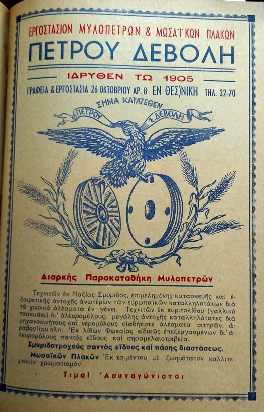 Το Εργοστάσιον Μυλόπετρων Πέτρου Σ. Δεβολή υπήρξε ο κύριος προμηθευτής σε μυλόπετρες του μακεδονικού χώρου. Ο Πέτρος Σ. Δεβολής καταγόταν από το Λέχοβο του νομού Καστοριάς και έμαθε την τέχνη της μυλόπετρας στην Κωνσταντινούπολη. Αρχικά ο Δεβολής εισήγαγε μυλόπετρες από την Κωνσταντινούπολη ή αλλού, στις οποίες έβαζε το εμπορικό του σήμα «Αποθήκη Μυλόπετρων Πέτρου Σ, Δεβολή» στη συνέχεια δημιούργησε το δικό του εργοστάσιο μυλόπετρων οπου έβαζε μεταλλικό εμπορικό σήμα «Εργοστάσιον Μυλόπετρων Πέτρος Σ. Δεβολής Θεσσαλονίκη» και αργότερα έβαζε εγχάρακτο εμπορικό σήμα με παράσταση αετού που πατάει σε δυο μυλόπετρες και επιγραφή «Σήμα Κατατεθέν Πέτρου Δεβολή Ελληνικής Κατασκευής». Το εργοστάσιο του Πέτρου Σ. Δεβολή έκλεισε οριστικά το 1954, καθώς άλλαξαν οι απαιτήσεις της αγοράς και η τεχνολογία των μύλων (Βαλαβανίδου Υδρόμυλοι).